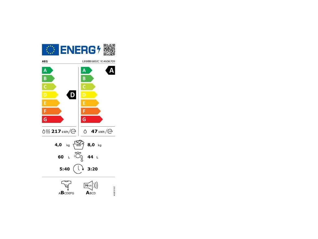 Vestavná pračka se sušičkou AEG L8WBE68SIC s kapacitou praní 8 kg a sušení 4 kg, technologií PowerClean, parní funkcí Steam Refresh, Wi-Fi připojením, tichým ÖKOInvertor motorem a aplikací My AEG Care pro chytré ovládání. Energetická třída D.