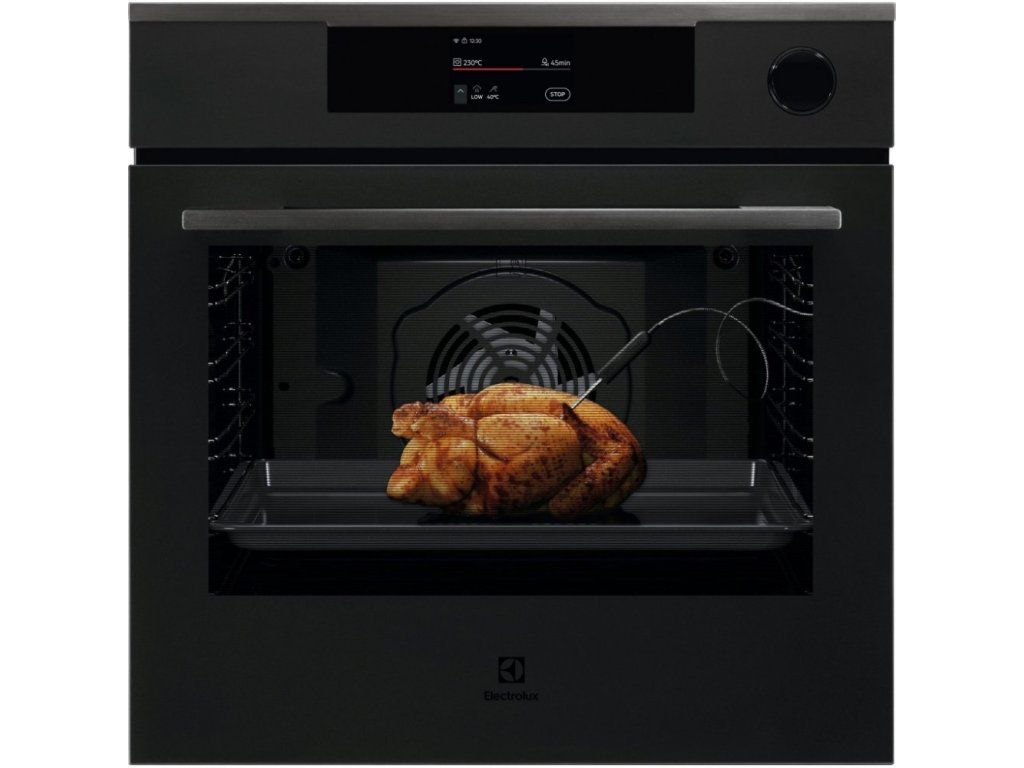 Vestavná trouba Electrolux SteamCrisp s párou, Wi-Fi, TFT displejem, pyrolytickým čištěním, sondou a objemem 72 l v matně černém designu.