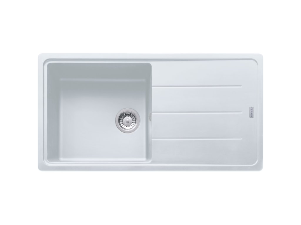Fragranitový dřez Basis. Cena zahrnuje: Sítkový ventil 3 1/2“ s přepadem. Sifon pro úsporu místa 6/4“ s odbočkou na myčku nádobí. 2