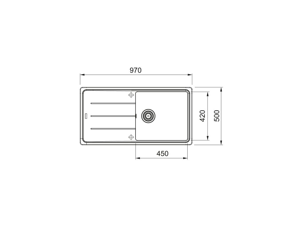 Fragranitový dřez Basis. Cena zahrnuje: Sítkový ventil 3 1/2“ s přepadem. Sifon pro úsporu místa 6/4“ s odbočkou na myčku nádobí. 2