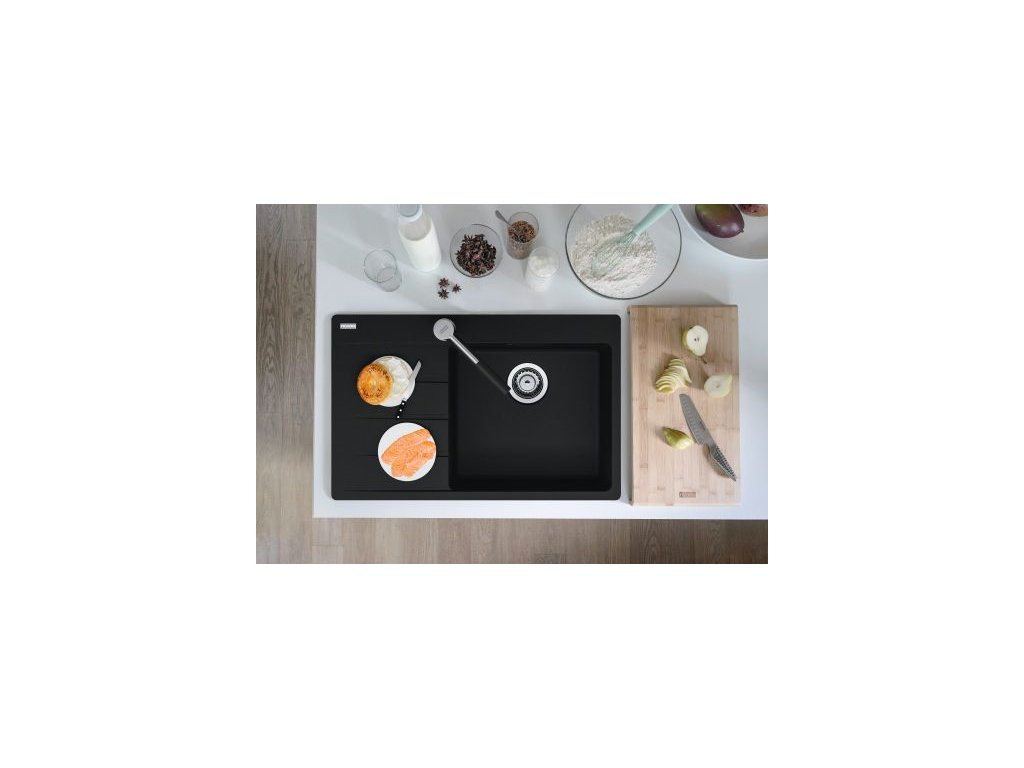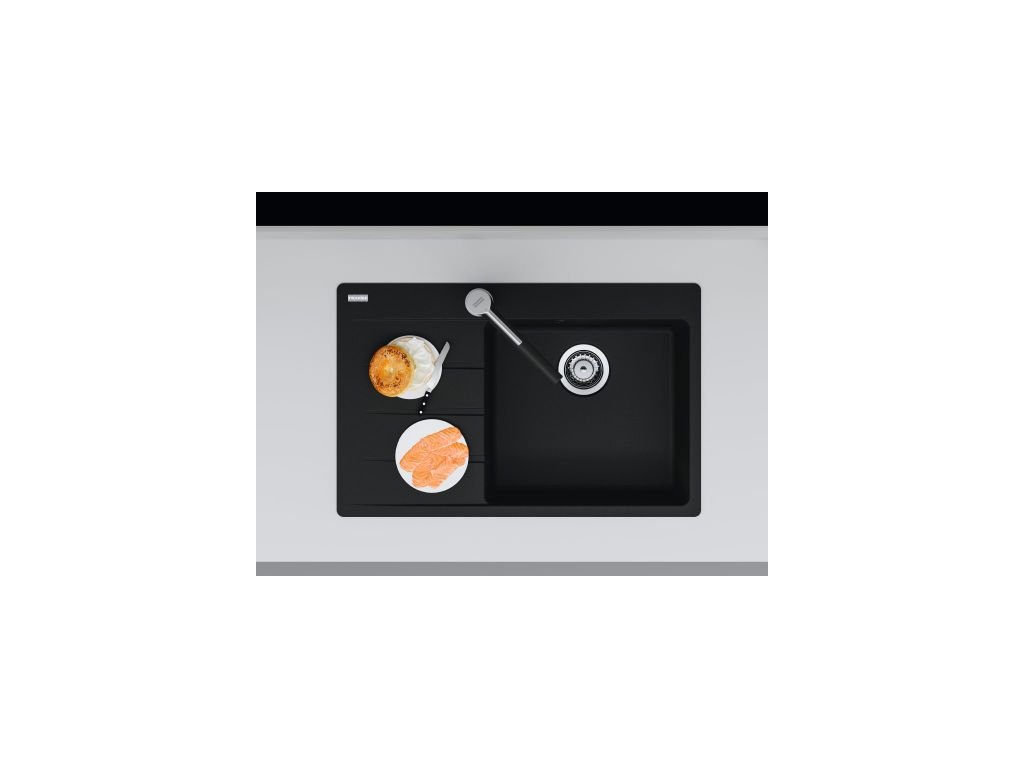 Fragranitový dřez Centro. Cena zahrnuje: Vymezovací podložku pro montáž kuchyňské baterie. Sítkový ventil 3 1/2“ s přepadem. Sifon