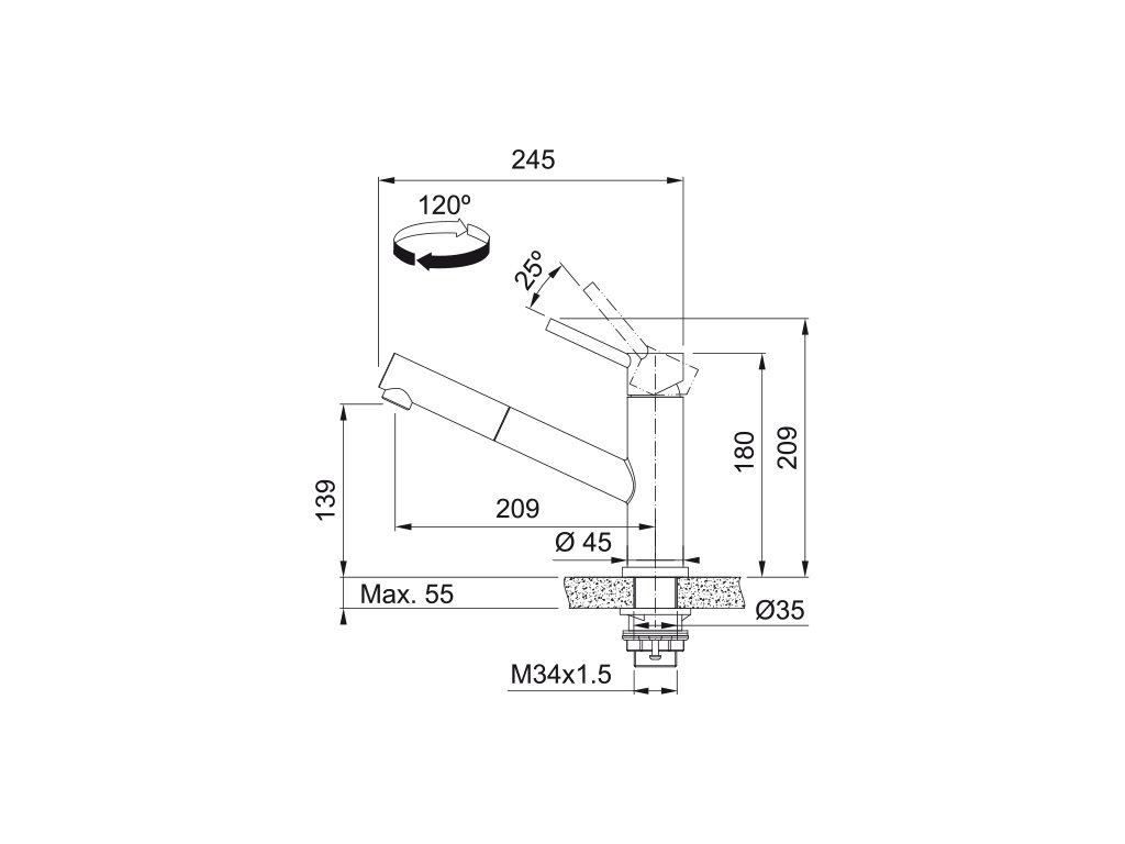 Otočná 120°. S vytahovací koncovkou osazenou perlátorem. Opletená sprchová hadice 150 cm. Připojení Hadičky 45 cm. Průtok vody 8,5