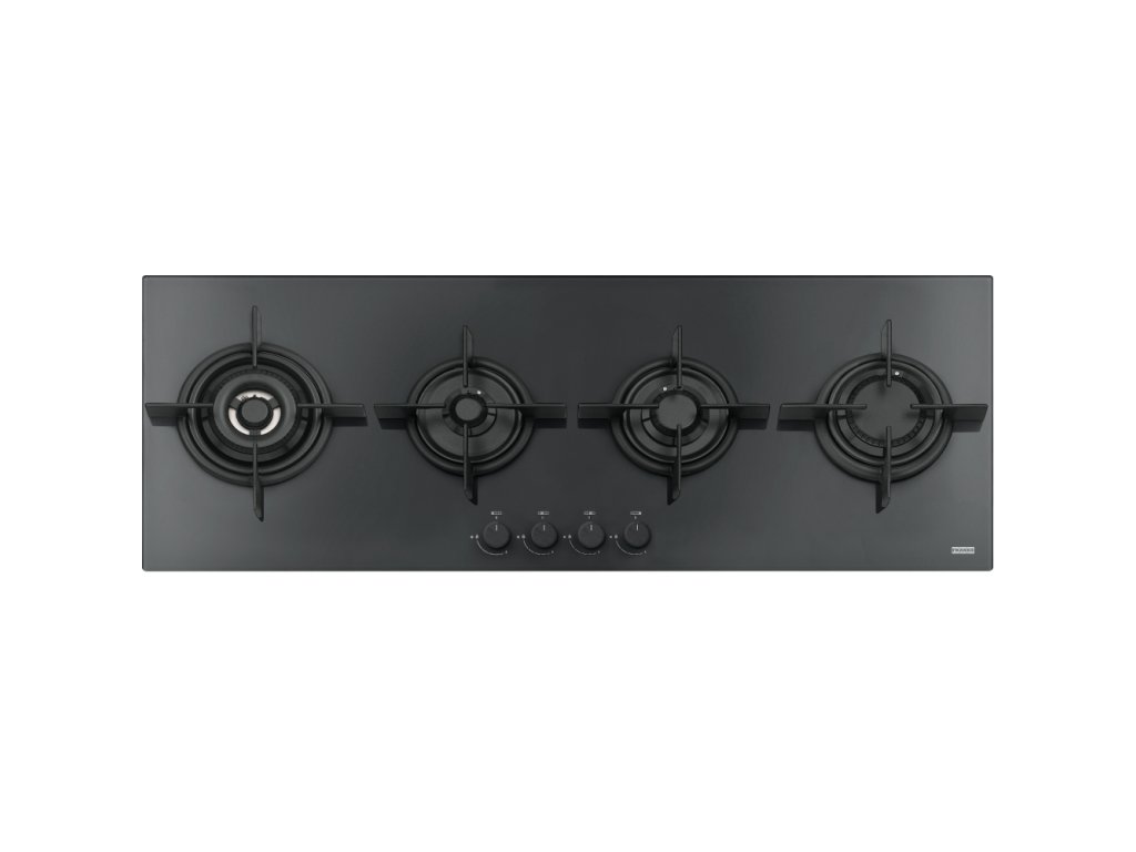 Plynová varná deska z řady Mythos. Provedení tvrzené černé sklo. 4 Plynové hořáky (1× Trojkorunka). Knoflíkové ovládání. Litinové