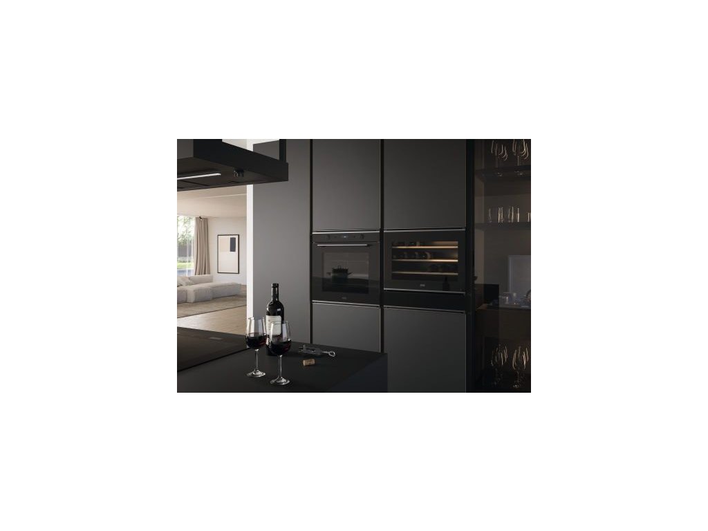 Vestavná vinotéka z řady Mythos. Kombinace černého skla a nerezi. Kapacita 66 litrů. Energetická třída G. Roční spotřeba energie 133 kWh/rok. Hlučnost 39 dB(A). Klimatická třída ST. 1 Teplotní zóna s rozsahem 4-18 °C. Vybavena 3 dřevěnými policemi s kapacitou 24 lahví. Dveře se otevírají do strany (systém Push Pull) s panty umístěnými vpravo.