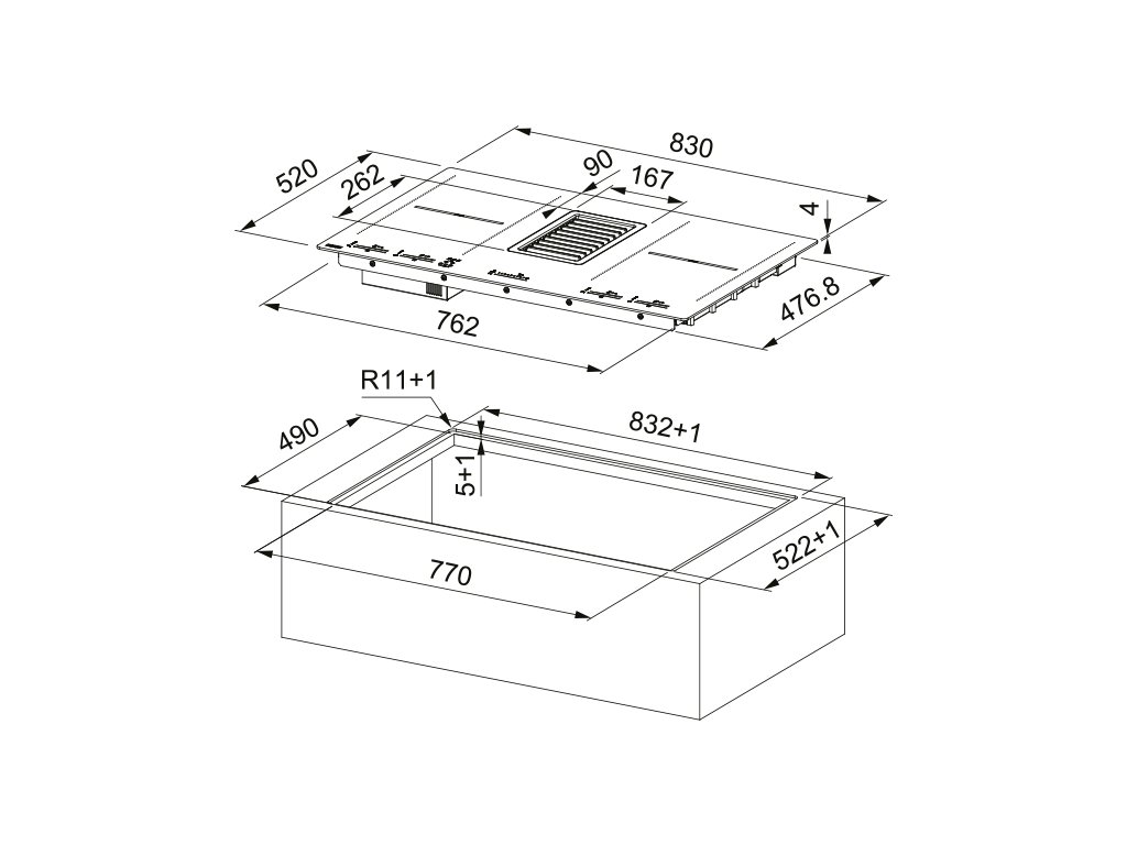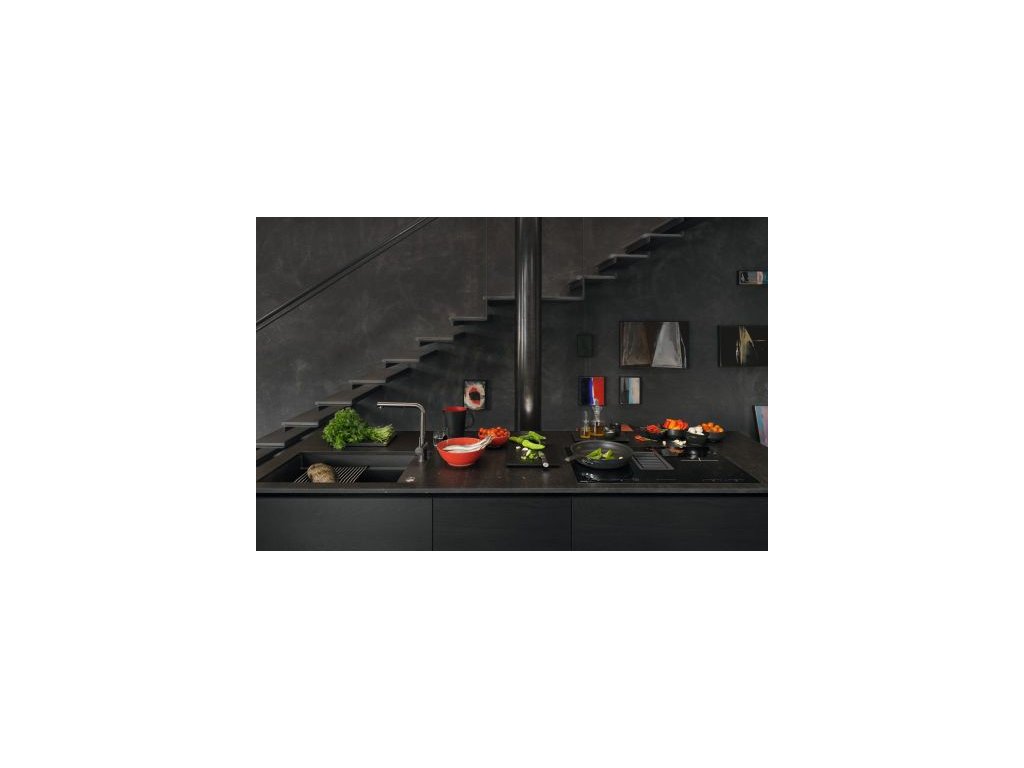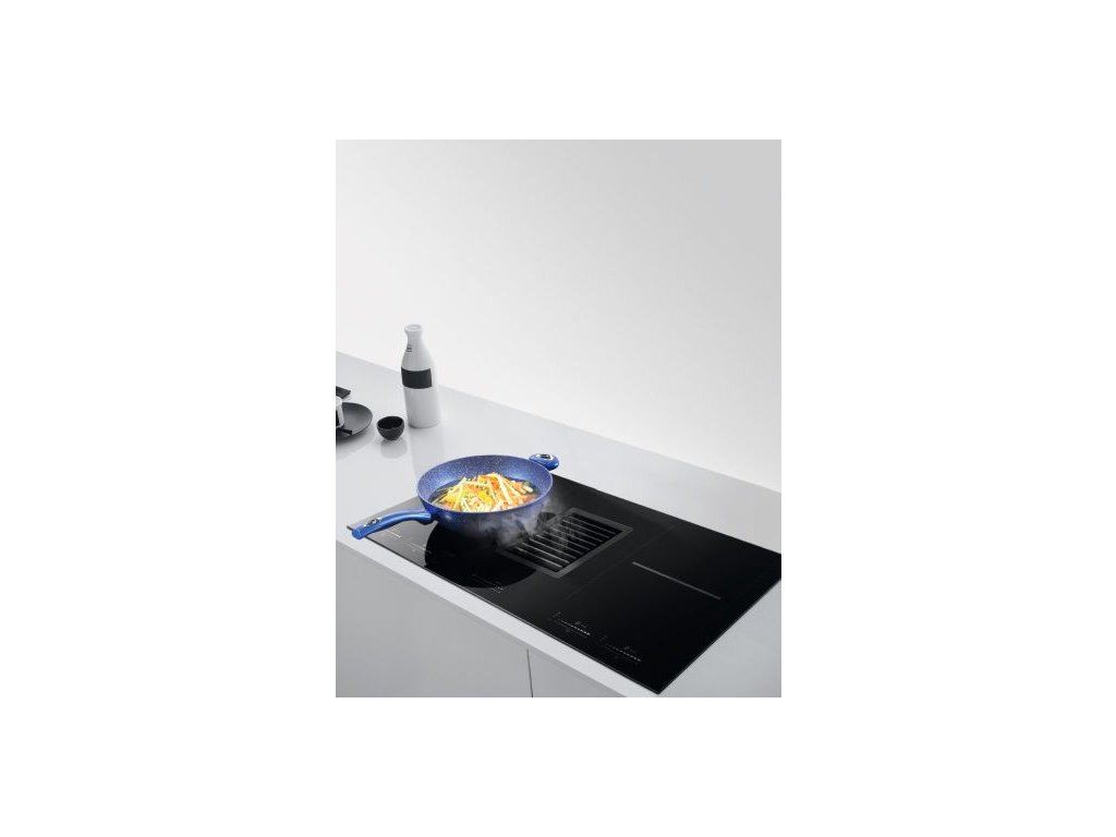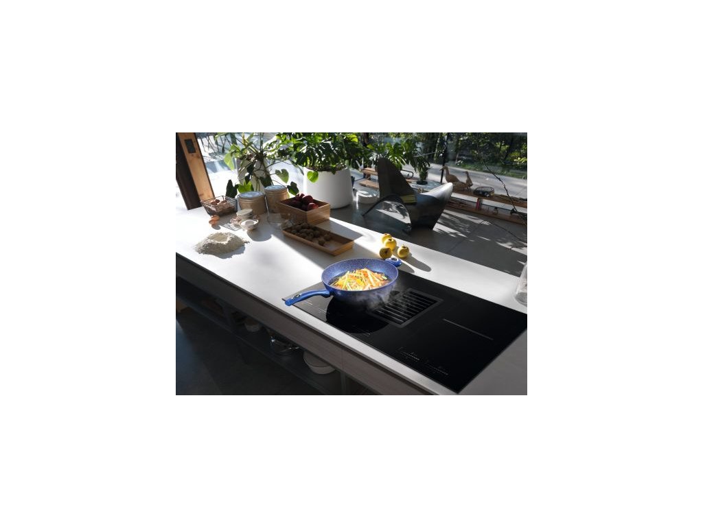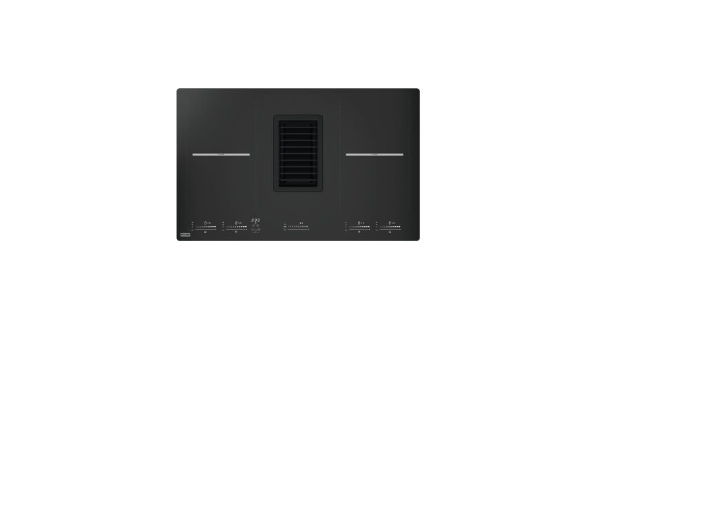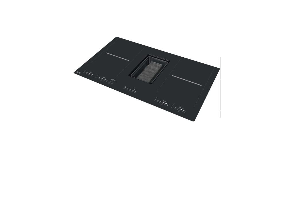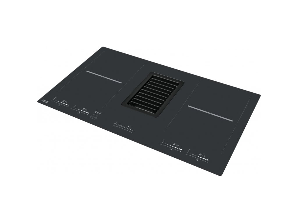 Odsavač par v indukční varné desce z řady Mythos. Provedení černé sklo s bílou grafikou. Energetická třída A+++. Odsavač par: Montáž do pracovní desky. Šířka 83 cm. Ovládání: Senzorové. LED bílý displej + Dotykový ovladač typu Slide. 8 Stupňů výkonu, 2× Intenzivní stupeň. Doběh. Automatická aktivace s varnou deskou. Voděodolný motor. Litinová mřížka. Max. výkon 700 m3/h (Norma EN 61591). Součástí odsavače par je vyjímatelný kolektor na tekutinu (V případě náhodné vylití tekutiny do odsavače par). Indukční varná deska: 4 Varné zóny. 2× Flexi zóna. Ovládání: 4 Dotykové ovladače typu Slide. 9 Úrovní ohřevu. Funkce: Keep warm. Booster. Stop&Go. Dětský zámek. Časovač 4×. Odsavač par i indukce jsou perfektně integrovány. Odsávání je aktivováno automaticky, jakmile je varná deska v provozu.