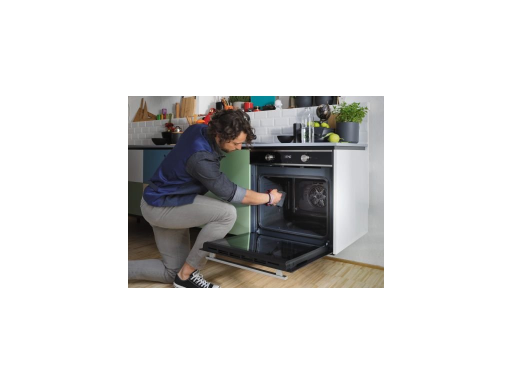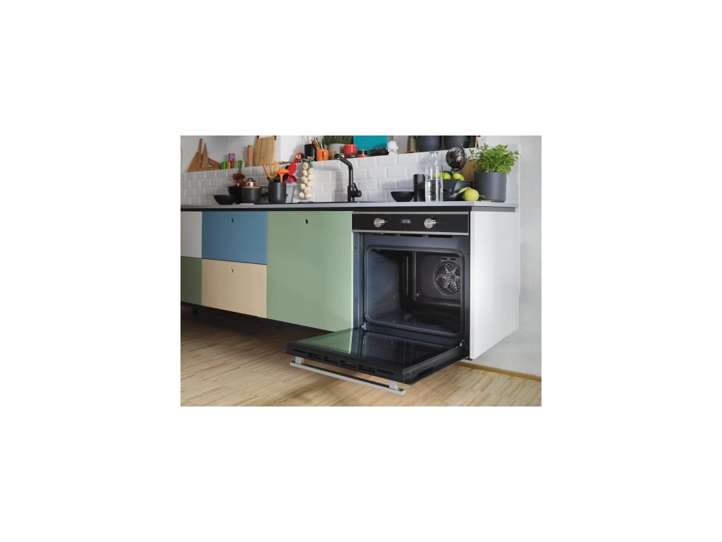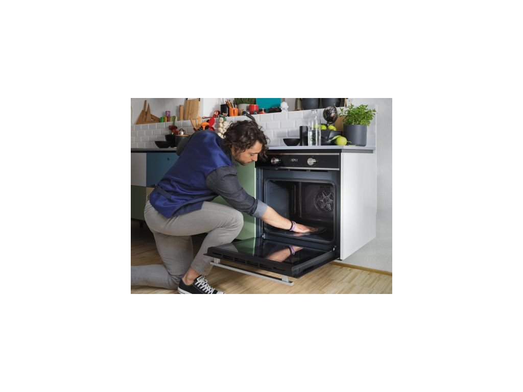 Vestavná trouba z řady Smart. Kombinace černého skla a nerezi. Kapacita 71 litrů. Energetická třída A. Nabízí 8 Manuálních funkcí + 1 Speciální funkci. Bílý displej + 2 Ovládací knoflíky. Smooth 2 Close dvířka. Press 2 Clean. Parní čištění. Bez výsuvů.