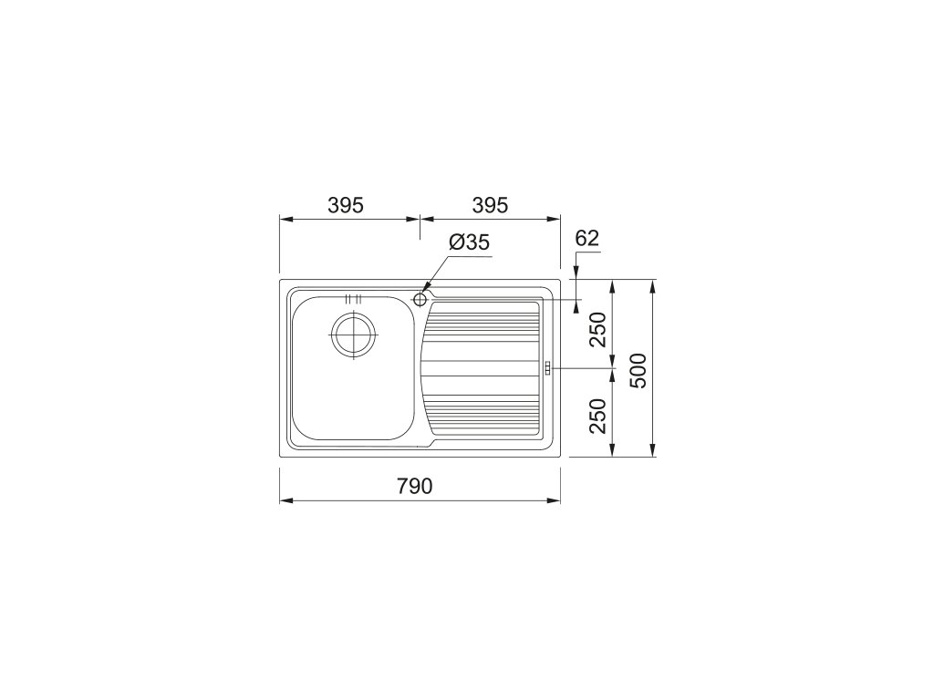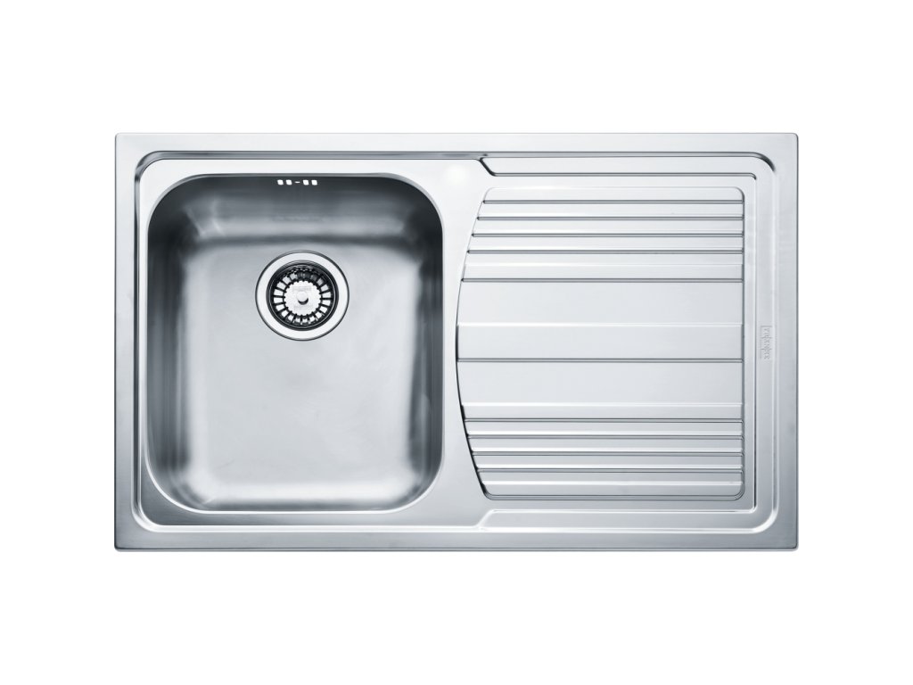 Nerezový dřez Logica. Cena zahrnuje: Sítkový ventil 3 1/2“ s přepadem. Sifon pro úsporu místa 6/4“ s odbočkou na myčku nádobí. Otvor