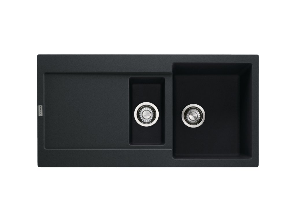Fragranitový dřez Maris. Cena zahrnuje: Otočný sítkový ventil 3 1/2“ s přepadem. Sítkový ventil 3 1/2“. Sifon pro úsporu místa 6/4“