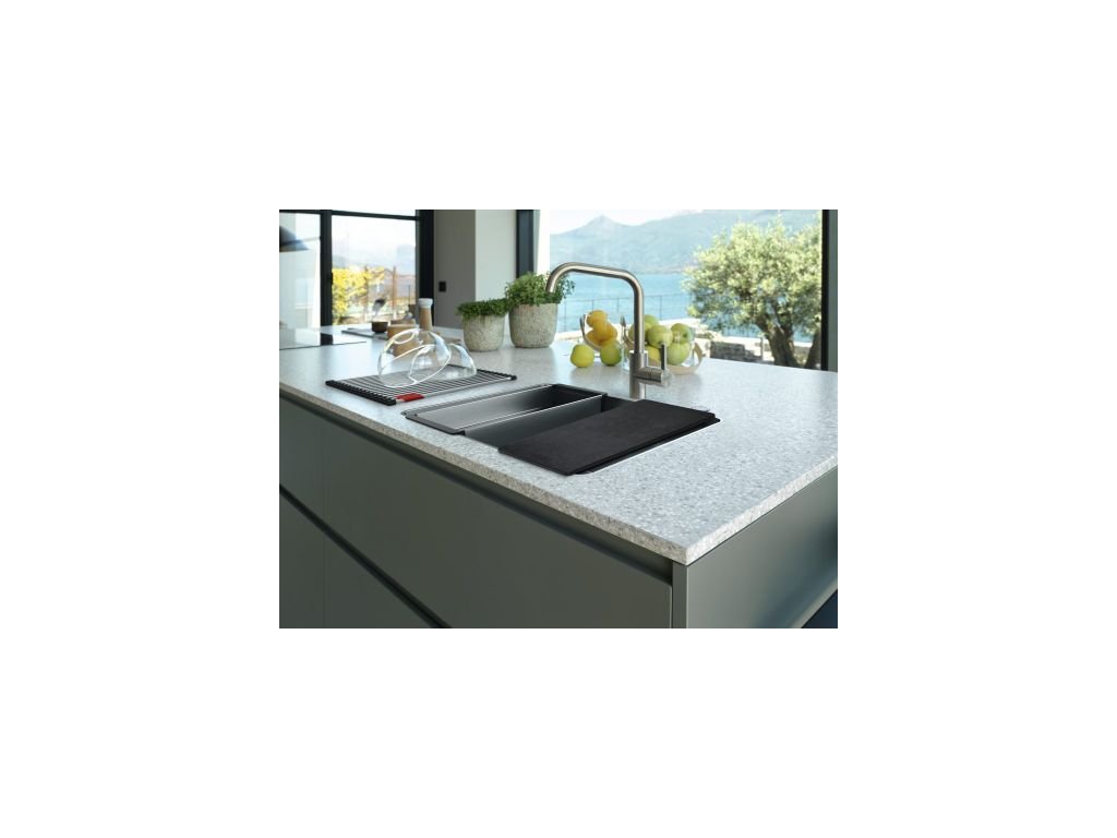 6/4“ s odbočkou na myčku nádobí. Plochý okraj, pro Easy Click nutný otvor do pracovní desky ∅ 35 mm. Dřez lze kombinovat s baterií