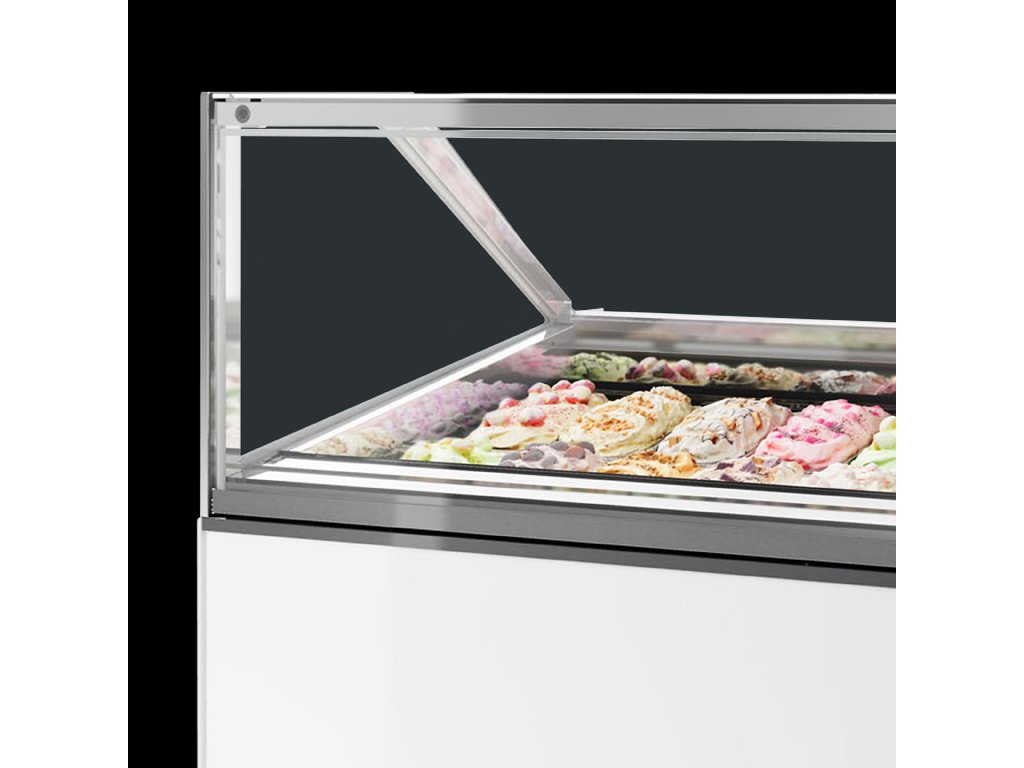 Distributory kopečkové zmrzliny řady MILLENNIUM ST jsou k dispozici ve velikostech, do kterých se vejde od 12 do 24 vaniček. Distributory MILLENNIUM jsou samozřejmě vhodné pro standardní gastronádoby na zmrzlinu GN 360x165x120 mm (nejsou součástí balení). Tento prémiový distributor zmrzliny s moderním rovným sklem tak může prezentovat širokou škálu lahodných chutí. Účinné ventilované chlazení zajišťuje rovnoměrné chlazení zmrzliny, takže má ideální teplotu pro snadné nabírání. Sklo je vyhřívané, aby se zabránilo orosení, a je vybaveno stahovací roletou.