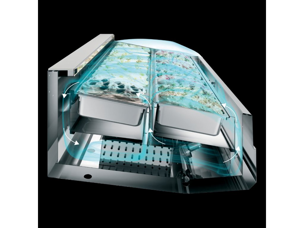 Prémiový distributor zmrzliny Super Capri je navržen tak, aby působil maximálním vizuálním dojmem. Distributor má čisté moderní linie a vnitřní LED osvětlení, aby co nejlépe prezentoval vaši zmrzlinu. Distributor je nakloněn směrem k zákazníkovi (pod úhlem 11°), aby bylo na výrobky lépe vidět. Zařízení má také jedinečný systém chlazení s dvojitým prouděním vzduchu, který umožňuje oddělené proudění chladného vzduchu nad každou řadou vaniček na zmrzlinu, což umožňuje účinnější chlazení a zároveň snižuje teplotní rozdíly. Přední, horní a boční skla jsou vyhřívaná, aby se snížila možnost vzniku kondenzace. Přední sklo je výklopné pro snazší údržbu.