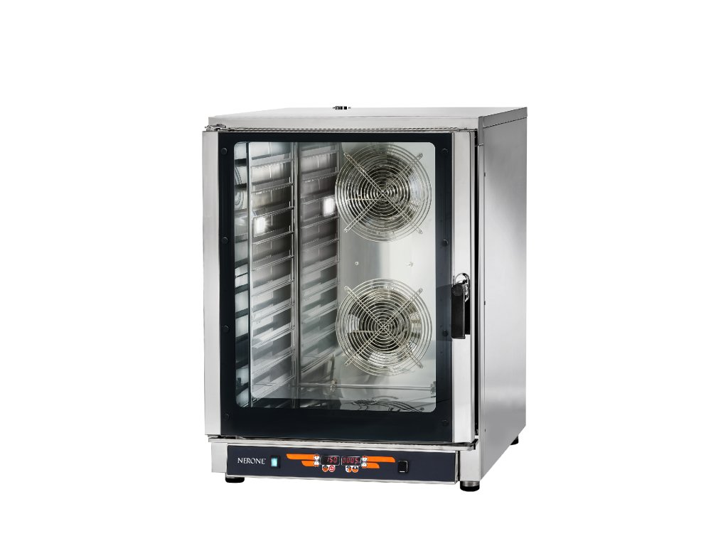 Digitální konvekční (horkovzdušná) pec s přivlhčováním a regulací páry 10 až 100 %. Díky páře nedochází k vysoušení produktů, je zachována jejich šťavnatost. U pečení pečiva má pára vliv na rovnoměrnou strukturu a následně jeho kvalitu. V sérii NORDline Nerone MID je počet roštů (600 x 400 mm) nebo GN 1/1 dán číslem v názvu za "MID". Rošty ani GN nejsou součástí.