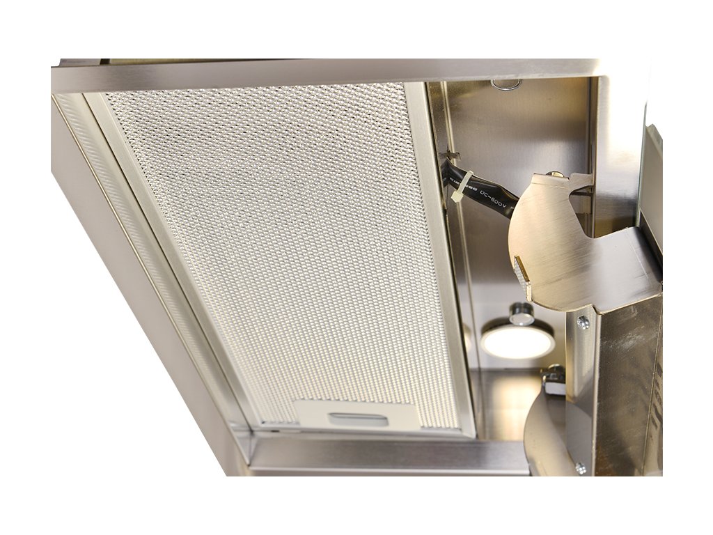 Neviditelná vestavná digestoř, 450 mm (pro 600 mm skříňku), nerez / bílé sklo, přehledné a snadno přístupné dotykové (sensorové) ovládání na výklopném spodním panelu, 3 rychlosti, max. výkon 710 m³/h (5 Pa), hlučnost Lw 40 – 67 dB(A), max. tlak 450 Pa, 15 min. časovač, kovové sendvičové tukové filtry, které lze mýt v myčce, výstupní průměr 150 mm, možnost práce v odtahovém i recirkulačním režimu, snadná montáž, Výbava: úsporné LED osvětlení 2 × 4 W s nastavitelnou intenzitou jasu.