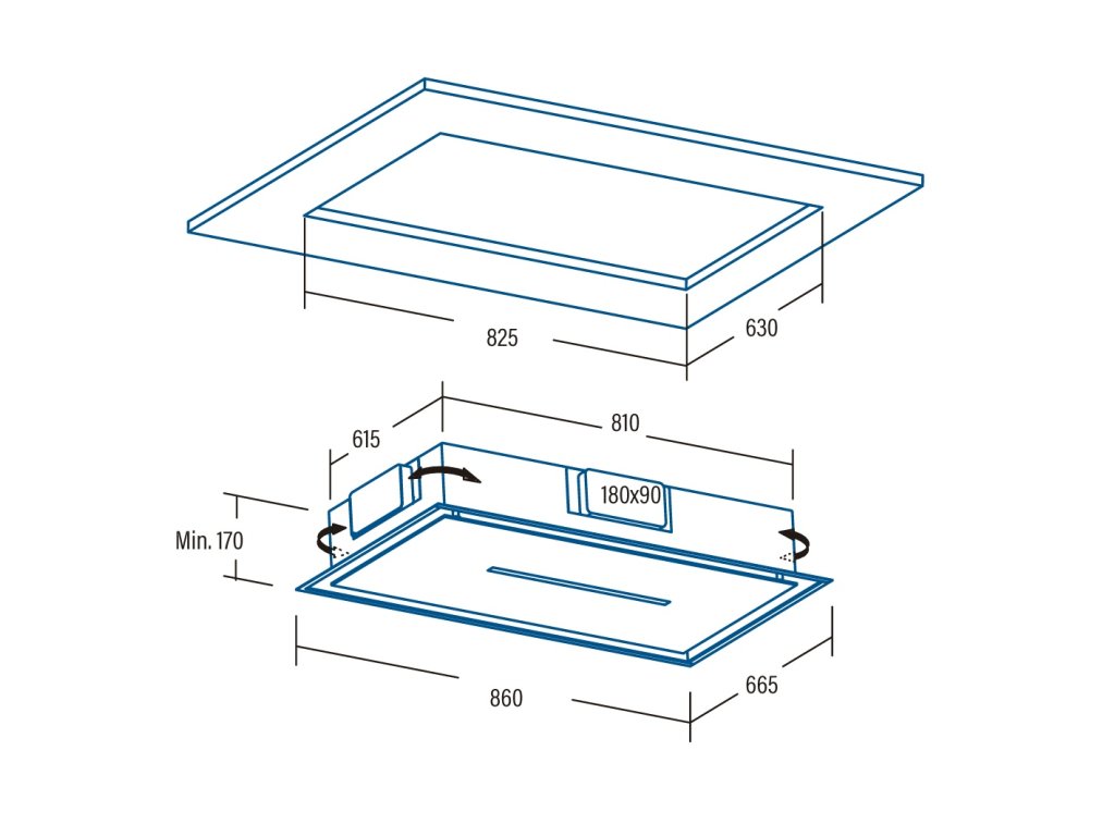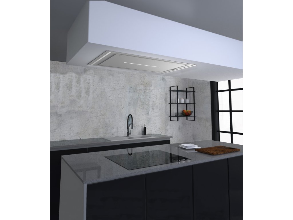 Stropní digestoř, šíře 90 cm, nerez, max. výkon 620 m³/h (5 Pa), hlučnost Lw 50 – 67 dB(A), 3 rychlosti + TURBO, kovové sendvičové tukové filtry, které lze mýt v myčce, výstupní průměr 180 × 90 mm, možnost práce v odtahovém režimu nebo recirkulačním režimu (při recirkulaci je potřeba přefiltrovaný vzduch vést potrubím k vhodnému místu výdechu zpět do místnosti), úsporné LED osvětlení (LED pásek) 7 W s regulací jasu a volbou teploty bílého světla, elektronické dálkové ovládání, zdarma dálkový ovladač i s bateriemi, zdarma přiloženy montážní konzole, Benefity: stropní digestoř je skrytá ve stropním podhledu a dává tak vyniknout ostatnímu vybavení kuchyně, výdechové hrdlo lze nastavit do 4 směrů, SLIM provedení – nízký profil jen 17 cm.
