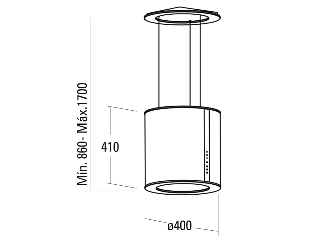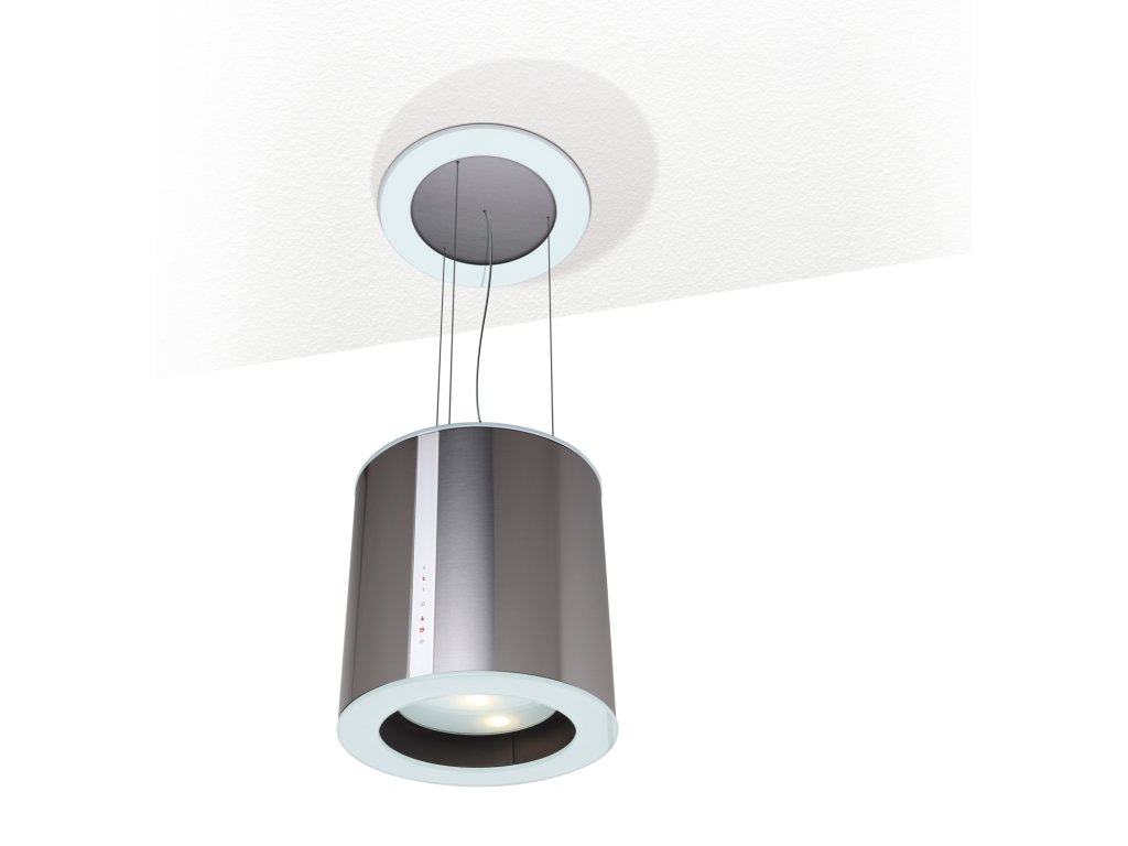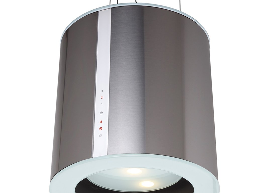 Ostrůvková lustrová digestoř, šíře 40 cm, nerez/bílé sklo, max. výkon 645 m³/h (5 Pa), hlučnost Lw 48 – 63 dB(A), 3 rychlosti, kovové sendvičové tukové filtry, které lze mýt v myčce, v myčce lze mýt i uhlíkový pachový filtr, digestoř určená pro provoz v recirkulačním režimu, úsporné LED osvětlení 3 × 3,5 W s regulací jasu, dotykové ovládání TC3V s doběhovým časovačem