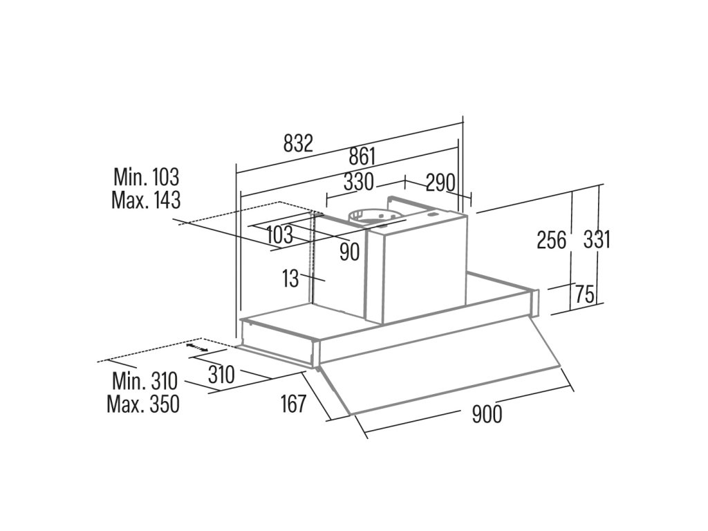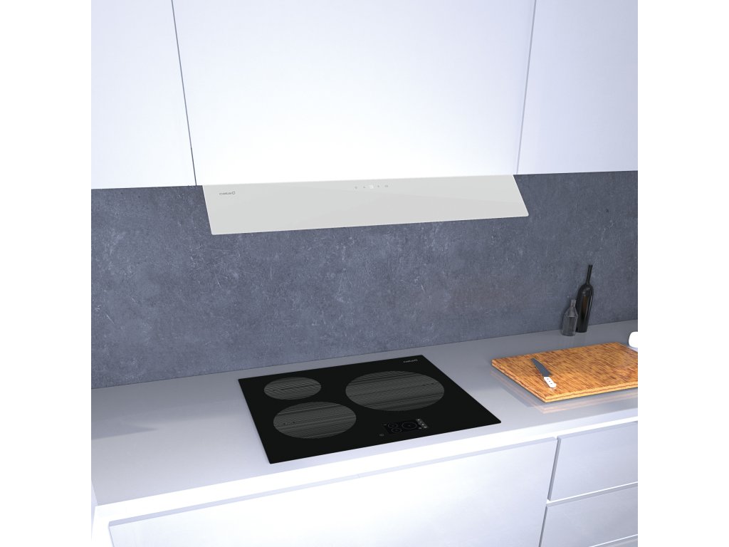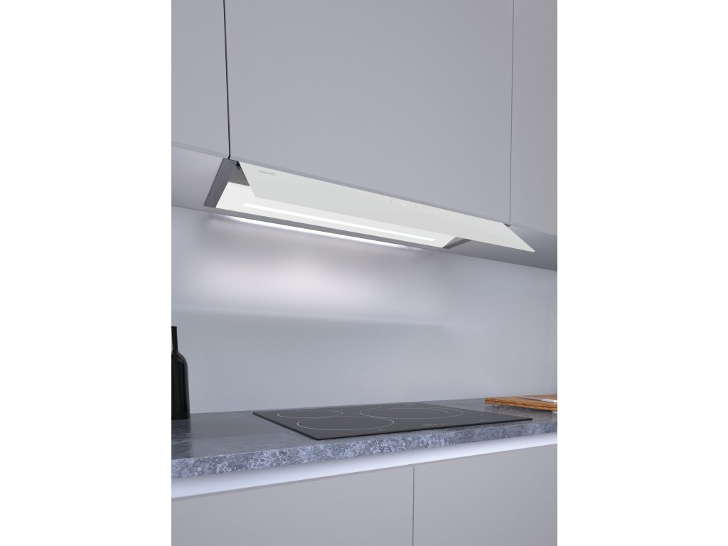 Neviditelná vestavná digestoř, 900 mm, nerez / bílé sklo, elektronické dotykové ovládání, 1 motor BT4DC, 5 rychlosti + TURBO, max. výkon 765 m³/h (5 Pa), hlučnost Lw 46 – 67 dB(A), max. tlak 357 Pa, kovové sendvičové tukové filtry, které lze mýt v myčce, výstupní průměr 150 mm, možnost práce v odtahovém i recirkulačním režimu, snadná montáž, Výbava: úsporné LED osvětlení 1 × 7 W LED pásek s nastavitelnou intenzitou i volitelnými 2 tóny světla , výklopné skleněné stínítko pro zvětšení plochy odsávání a pro ochranu dvířek skříňky.