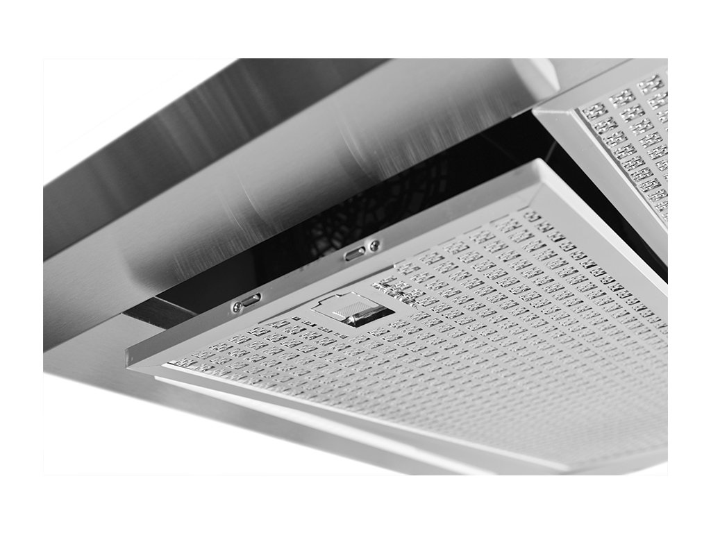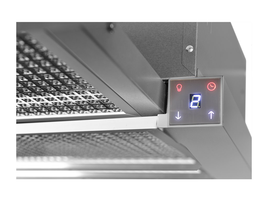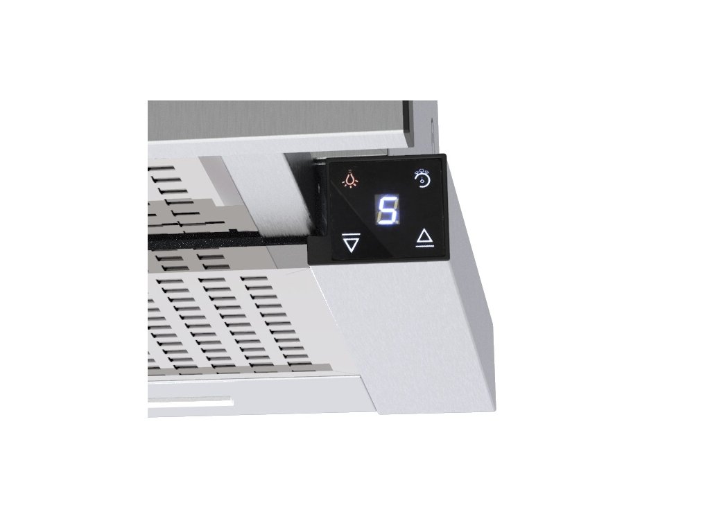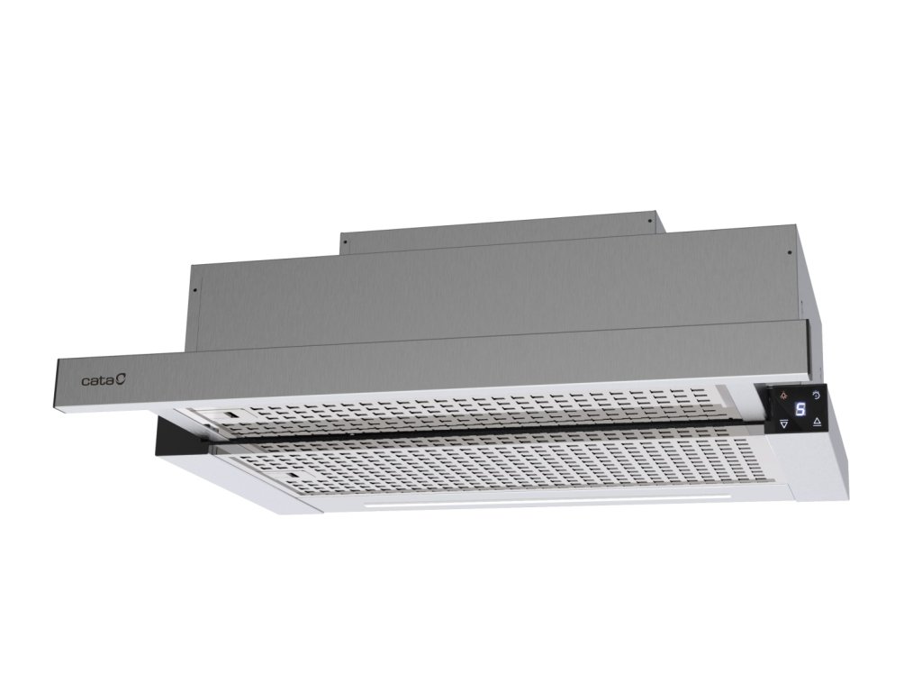 Vestavná výsuvná digestoř s bezkartáčovým motorem: šíře 600 mm, nerez lišta, 1 motor T1DC 90 W, 5 rychlostí + TURBO, 575 m3/h (5 Pa), max. tlak 300 Pa, max. hlučnost Lw 63 dB.