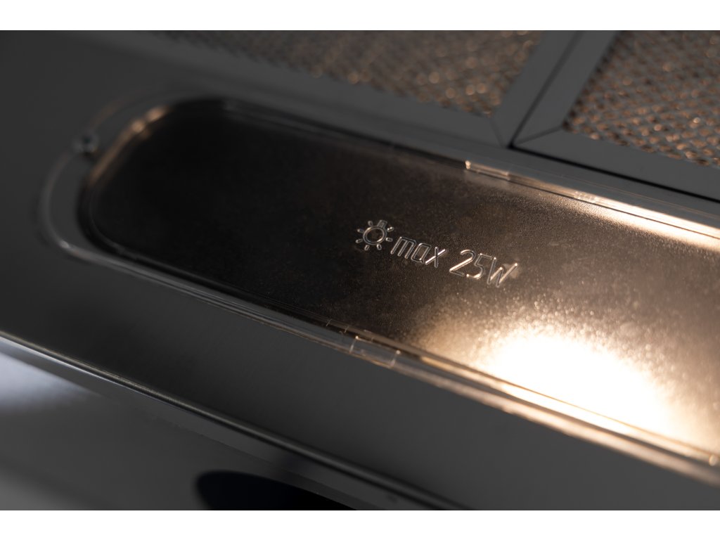 Podskříňková digestoř, šíře 60 cm,nerez, max. výkon 160 m³/h (15 Pa), hlučnost Lw 50 – 61 dB(A), 3 rychlosti, mechanické tlačítkové ovládání, kovové sendvičové tukové filtry, které lze mýt v myčce, možnost práce v odtahovém i recirkulačním režimu, výstupní průměr 120 mm, osvětlení 1 × 4 W LED žárovka E14, Výbava: zdarma zpětná klapka