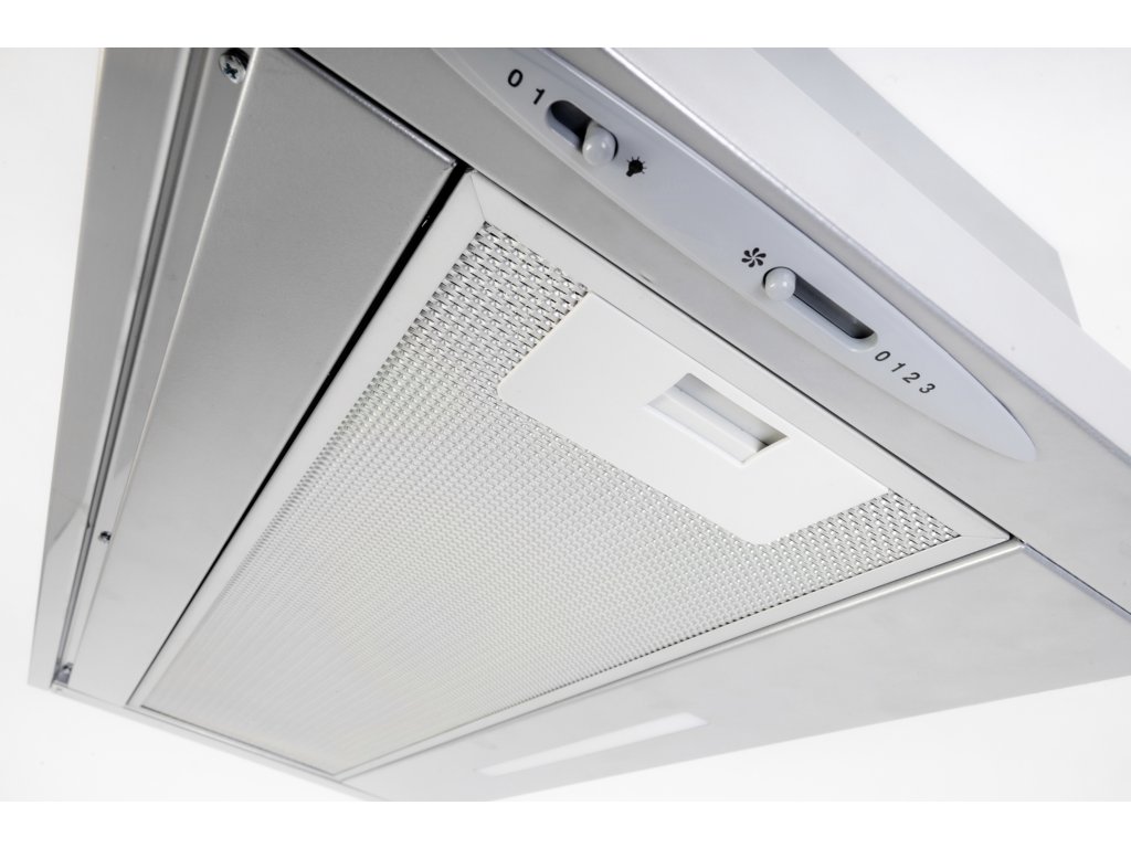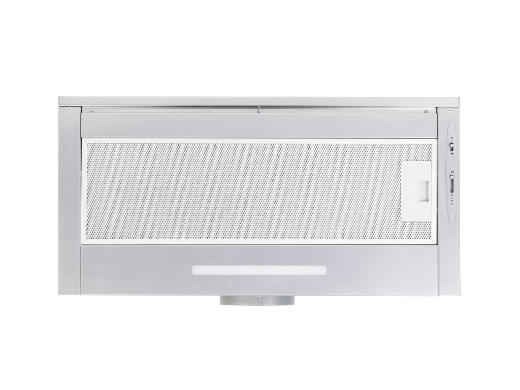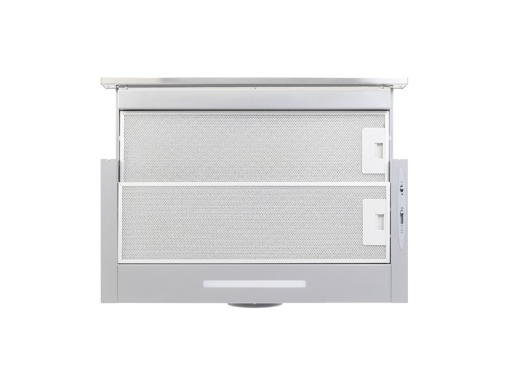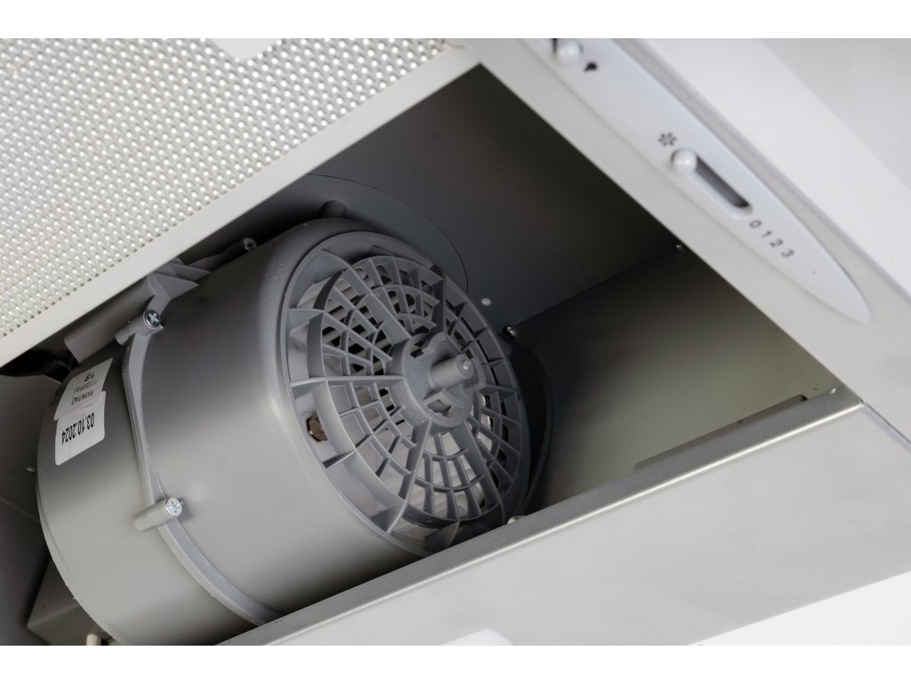 Vestavná digestoř výsuvná, jediná na trhu s odtahem dozadu nebo nahoru (oba 120 mm), šíře 50 cm, bílá s nerez lištou, max. výkon 338 m³/h (15 Pa), hlučnost Lw 56 – 71 dB(A), 3 rychlosti, odsávací jednotky mají individuálně vyvažovanou turbínu, motory jsou opatřené vratnými tepelnými pojistkami (při přetížení motoru vypne, po jeho vychladnutí opět sepne), mechanické posuvné ovládání, kovové sendvičové tukové filtry, které lze mýt v myčce, možnost práce v odtahovém i recirkulačním režimu, Výbava: úsporné LED osvětlení 1 × 2,8 W (LED pásek), zdarma zpětná klapka