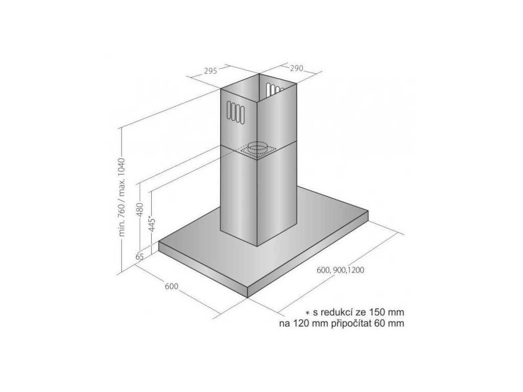 Ostrůvková digestoř, šíře 60 cm, nerez, max. výkon 763 m³/h (5 Pa), hlučnost Lw 50 – 71 dB(A), 3 rychlosti + TURBO, odsávací jednotky mají individuálně vyvažovanou turbínu, motory jsou opatřené vratnými tepelnými pojistkami (při přetížení motoru vypne, po jeho vychladnutí opět sepne), kovové sendvičové tukové filtry, které lze mýt v myčce, výstupní průměr 150 mm, možnost práce v odtahovém i recirkulačním režimu, VIP výbava: úsporné LED osvětlení 4 × 2 W, elektronické dotykové ovládání s doběhovým časovačem, zdarma dálkový ovladač i s bateriemi, zdarma redukce na 120 mm a zpětná klapka, Benefity: používání dálkového ovládání usnadňuje údržbu digestoře (méně otisků na digestoři = snazší čištění), ovladač je opatřený magnetem, lze jej přichytit třeba na dveře lednice (může být snadno po ruce, nikam nezapadne)