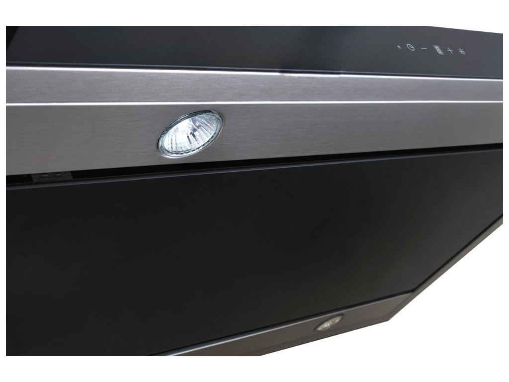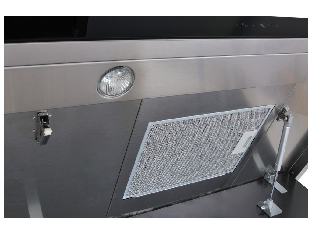 Ostrůvková digestoř, šíře 90 cm, nerez / černé sklo, max. výkon 822 m³/h (5 Pa), hlučnost Lw 51 – 69 dB(A), 3 rychlosti + TURBO, odsávací jednotky mají individuálně vyvažovanou turbínu, motory jsou opatřené vratnými tepelnými pojistkami (při přetížení motoru vypne, po jeho vychladnutí opět sepne), kovové sendvičové tukové filtry, které lze mýt v myčce, výstupní průměr 150 mm, možnost práce v odtahovém i recirkulačním režimu, VIP výbava: úsporné LED osvětlení 4 × 2 W, elektronické dotykové ovládání s doběhovým časovačem, zdarma dálkový ovladač i s bateriemi, zdarma redukce na 120 mm a zpětná klapka, Benefity: používání dálkového ovládání usnadňuje údržbu digestoře (méně otisků na digestoři = snazší čištění), ovladač je opatřený magnetem, lze jej přichytit třeba na dveře lednice (může být snadno po ruce, nikam nezapadne)