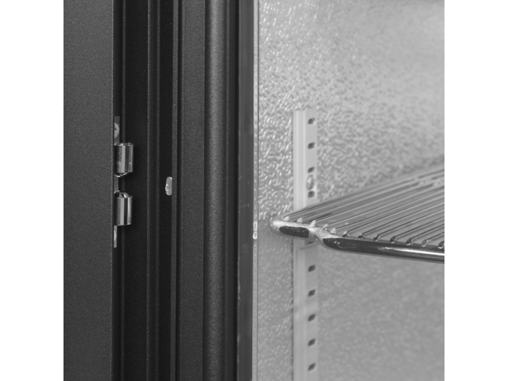 Minibar je vyroben z pevných materiálů a má nastavitelné chromované police s těsně umístěnými dráty, které zajišťují vysokou kapacitu a stabilitu. Navíc má samozavírací hliníkové posuvné dveře s dvojitým tvrzeným sklem. To pomáhá šetřit energii, ale také to zajišťuje skvělou viditelnost výrobků.