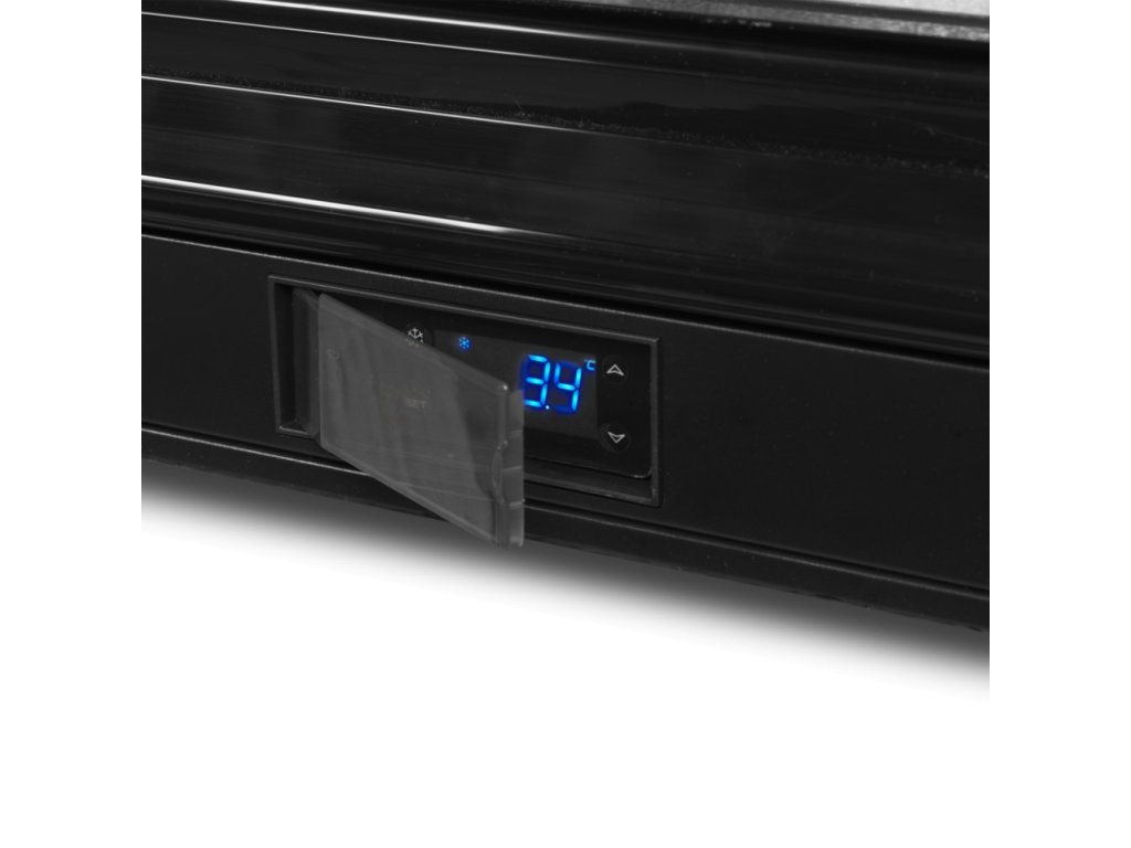 Minibar má samozavírací posuvné dveře s dvojitým tvrzeným sklem, která zajišťují pěknou prezentaci výrobků. Nastavitelné drátěné police mají bílý plastový povrch pro snadnou údržbu. Minibar je ideální pro rušné barové prostředí a díky černému exteriéru a hliníkovému interiéru ve štukovém provedení působí moderně. Skvělá volba pro každý bar.