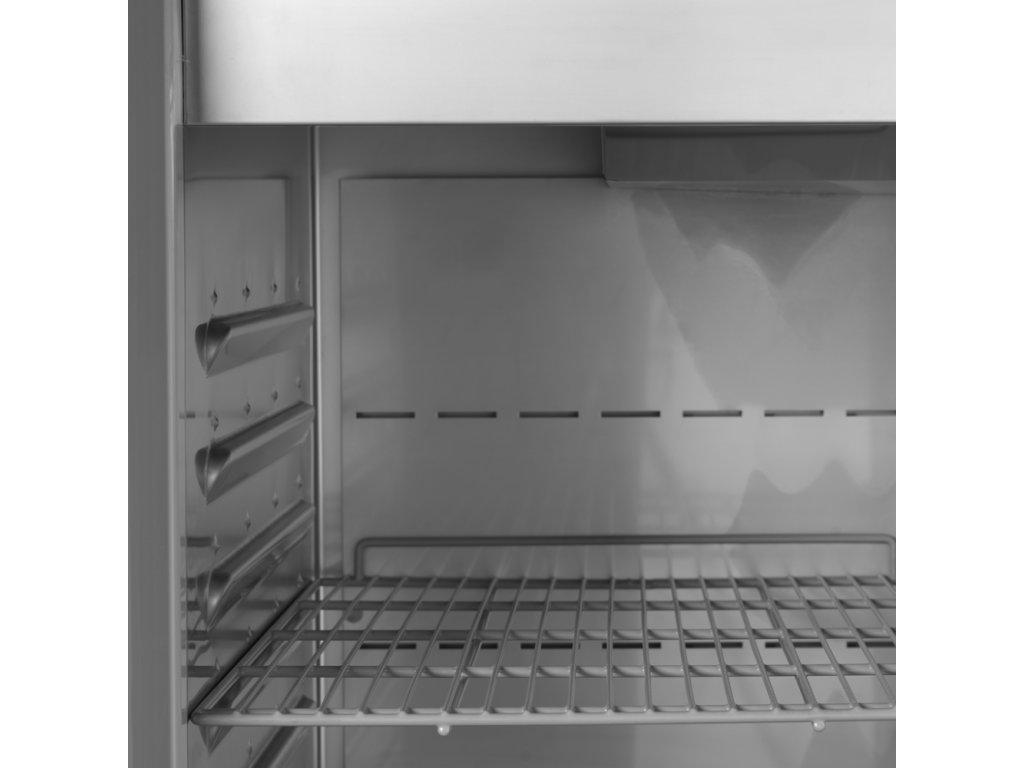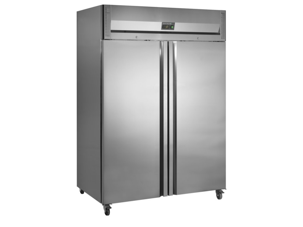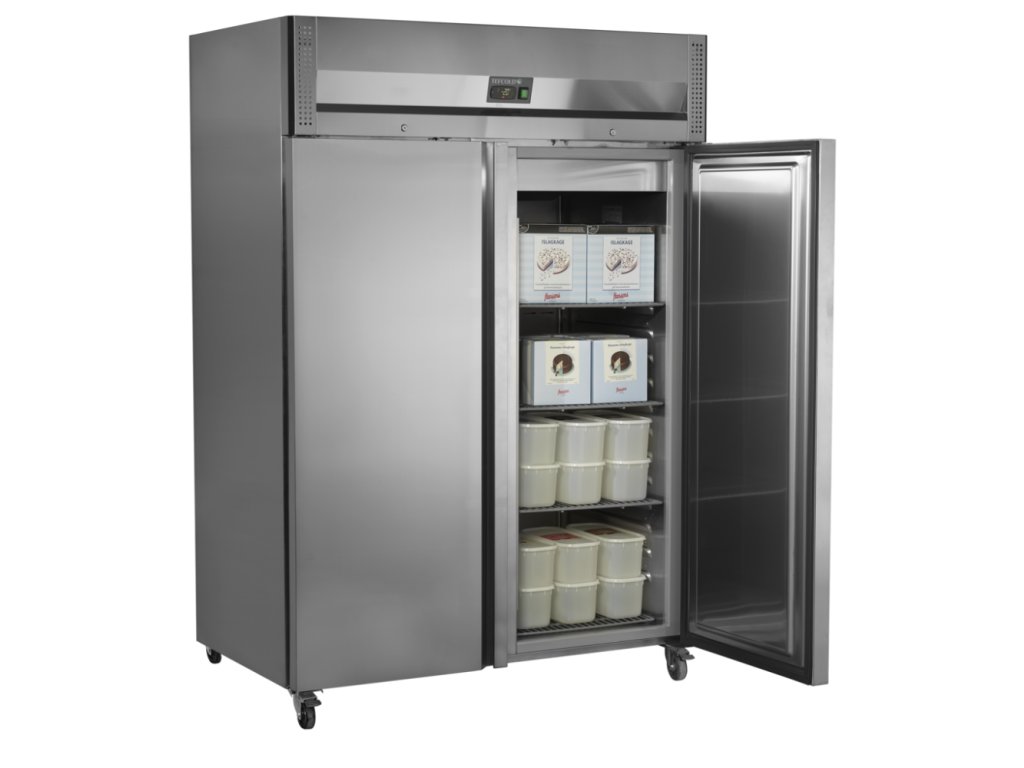 RF1420X1 je energeticky úsporná mrazicí skříň pro profesionální prostředí. Má o 64 % nižší spotřebu energie ve srovnání s předchozím modelem RF1420. Tato mrazicí skříň s plnými dveřmi je vyrobena z odolné nerezové oceli SS304, což je zárukou, že vydrží podmínky rušné kuchyně. Je dodávána s nastavitelnými policemi GN2/1 a samzavírací dveře s 105° zarážkou pro snadný přístup a plnění. Skříň je vybavena odolnými kolečky, která jsou užitečná při čištění. Má účinný ventilační chladicí systém, který zajišťuje optimální teplotu skladovaného obsahu, a teplotu lze snadno nastavit na digitálním ovladači. Ovladač nabízí NFC konektivitu a funkci Bluetooth. To znamená, že pomocí aplikace můžete ovládat osvětlení, sledovat teplotu ve skříni, a dokonce exportovat data pro snadné podávání zpráv.