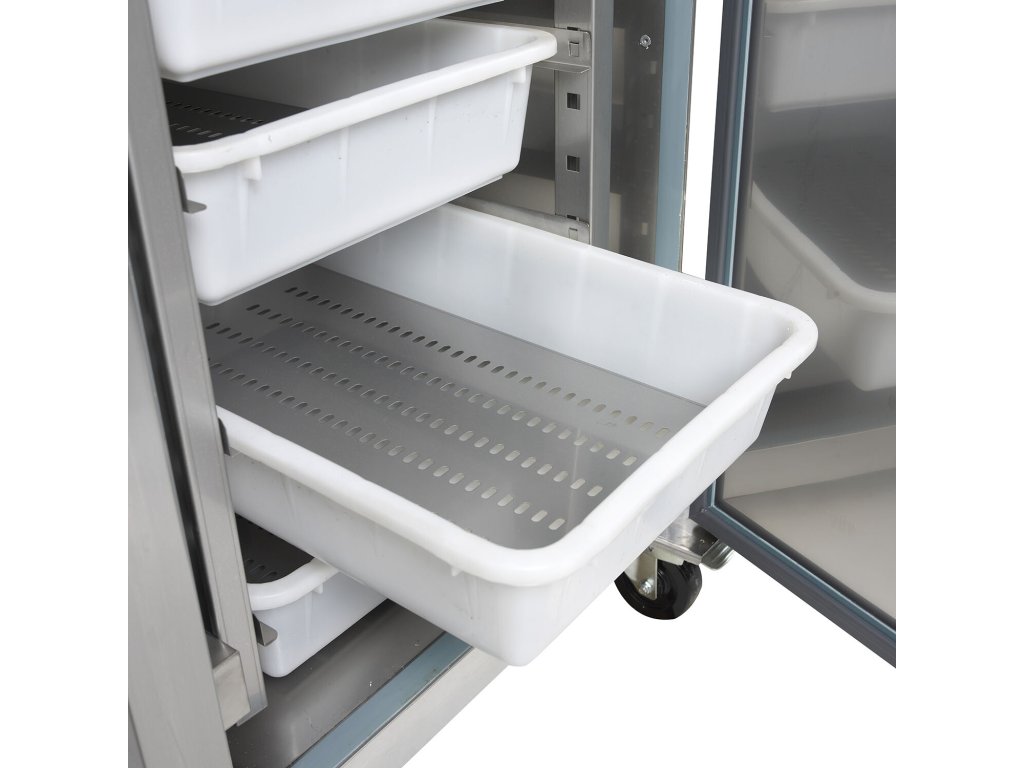 Řada chladicích skříní na ryby RKS F je vytvořena pro profesionální kuchyně a je ideální pro optimální skladování ryb a mořských plodů. Je vybavena 7 podnosy na ryby se z nerezavějící oceli. Skříň je vyrobena z vysoce kvalitní nerezavějící oceli SS304 pro gastronomii a má silná kolečka pro přesouvání, což se hodí při čištění.
