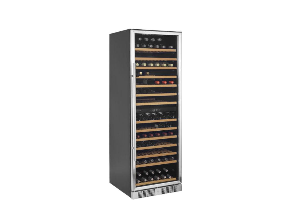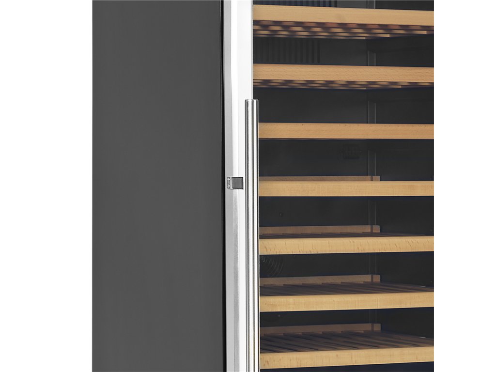 Vinotéky řady TFW-2S s prvky z nerezové oceli nabízejí moderní řešení pro vystavování a skladování lahví s vínem. Vinotéka má černý vnější povrch a rám a madlo dveří z nerezové oceli. Mají elegantní design s nerezovým rámem dveří a spodním čelním panelem, černými vnějšími boky a černým interiérem, jemné LED osvětlení a výsuvné dřevěné police. Vinotéka je vybavena moderním chladicím systémem, který umožňuje nastavení dvou rozdílných teplot. Agregát disponuje nízkou hlučností a spotřebou elektrické energie. Tento model má dvě teplotní zóny, které lze nastavit s maximální odchylkou 10 °C – můžete tedy v jedné zóně skladovat např. bílé víno při 7 °C a ve druhé červené víno při 17 °C.