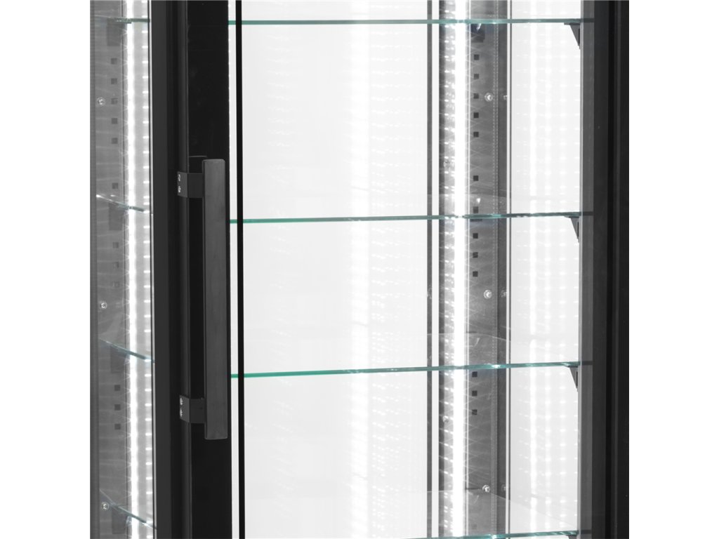 Mrazicí vitrína TEFCOLD UPD 400 F Black má všechny čtyři strany prosklené s dvojitým izolačním sklem, což zajišťuje vynikající prezentaci vystavených produktů. Má také bezrámové dveře s vyhřívaným rámem. Výšku mezi skleněnými policemi je možné změnit dle potřeby. Vitrína je skvělá např. pro prezntaci zmrzlinových pohárů a jiných mražených pochutin.
